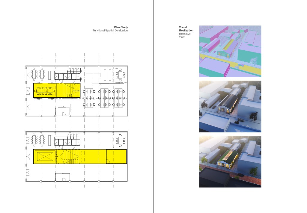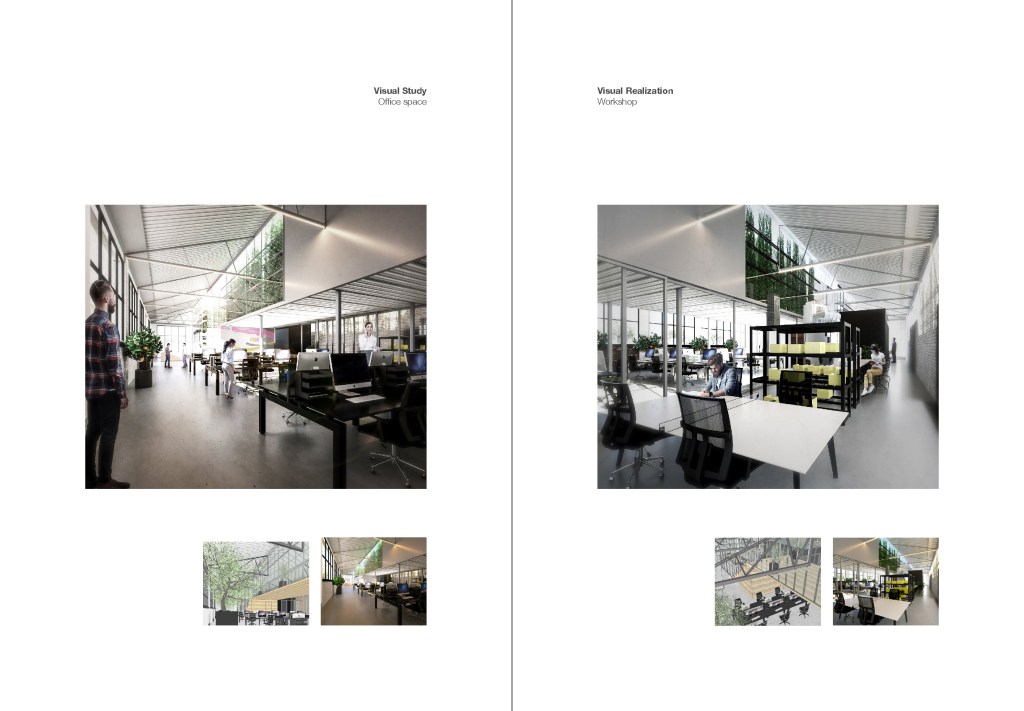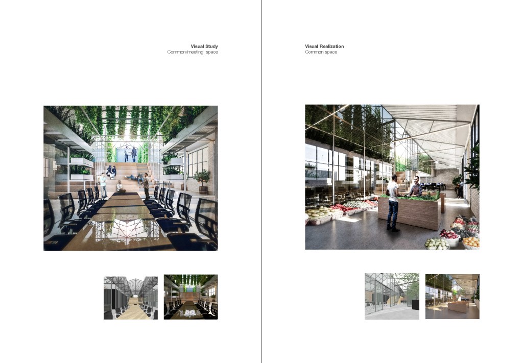 The idea is to revive the old warehouse and invite more people inside the warehouse where people could benefit from open space under one roof and enjoy harvesting from the greenhouse inside, which in return be a nice working environment for an architectural office.